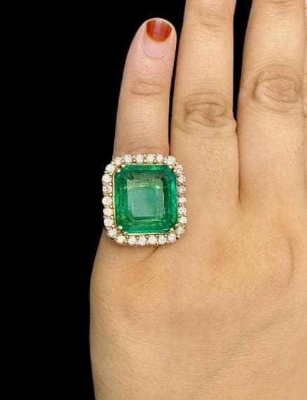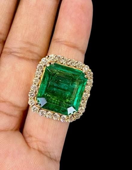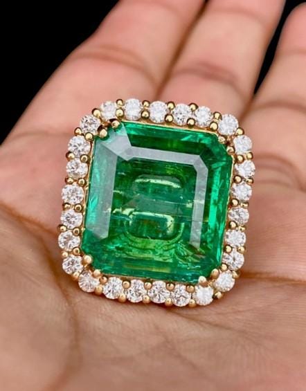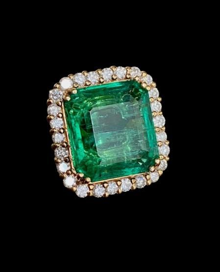 Handmade 20.89Ct Zambian Emerald Ring: 18K Yellow Gold Diamond Halo