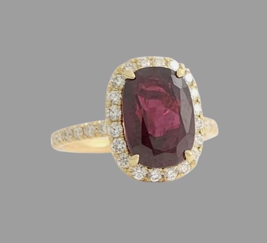 The elegant yellow gold setting adds warmth and sophistication, perfectly complementing the ruby’s deep tone while offering a stunning contrast to the sparkling diamonds. Designed for those who appreciate refined elegance and exquisite craftsmanship, this ring is both luxurious and timeless.