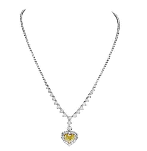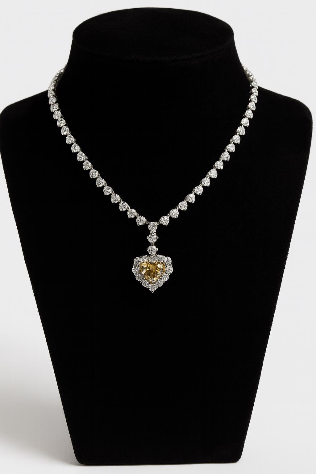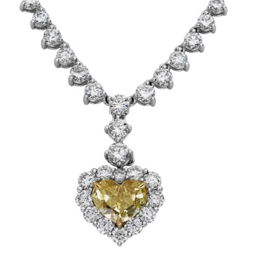 Every diamond is carefully hand-set by master jewelers to ensure maximum brilliance, fire, and symmetry. The heart-shaped diamonds exude romantic allure, while the round brilliant diamonds add timeless sparkle and balance. The fine 18K white gold setting enhances the contrast between the white and canary hues, giving the necklace a radiant, luxurious glow.