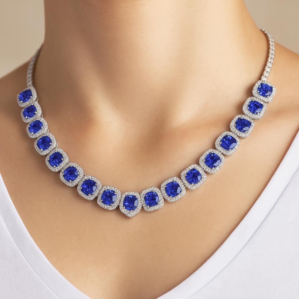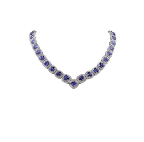 Each Tanzanite gemstone is hand-selected for its vivid saturation, fire, and clarity — a true representation of nature’s finest artistry. The diamonds, ethically sourced and precisely cut, create a halo of sparkle that enhances every shade of blue-violet radiating from the Tanzanite. The craftsmanship reflects meticulous precision, ensuring balance, symmetry, and a fluid drape that elegantly contours the neckline.