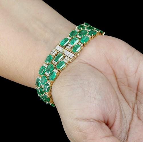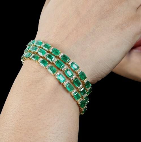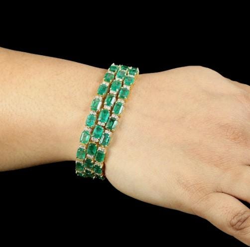 This exquisite bracelet features vibrant green emeralds paired with sparkling white diamonds, masterfully set in solid 14K gold. The triple-row design creates a bold yet refined look, radiating luxury from every angle. Perfectly balanced, it’s the kind of bracelet that transitions effortlessly from day to evening, from refined events to elegant celebrations.