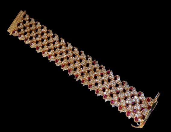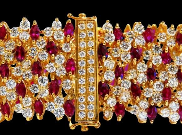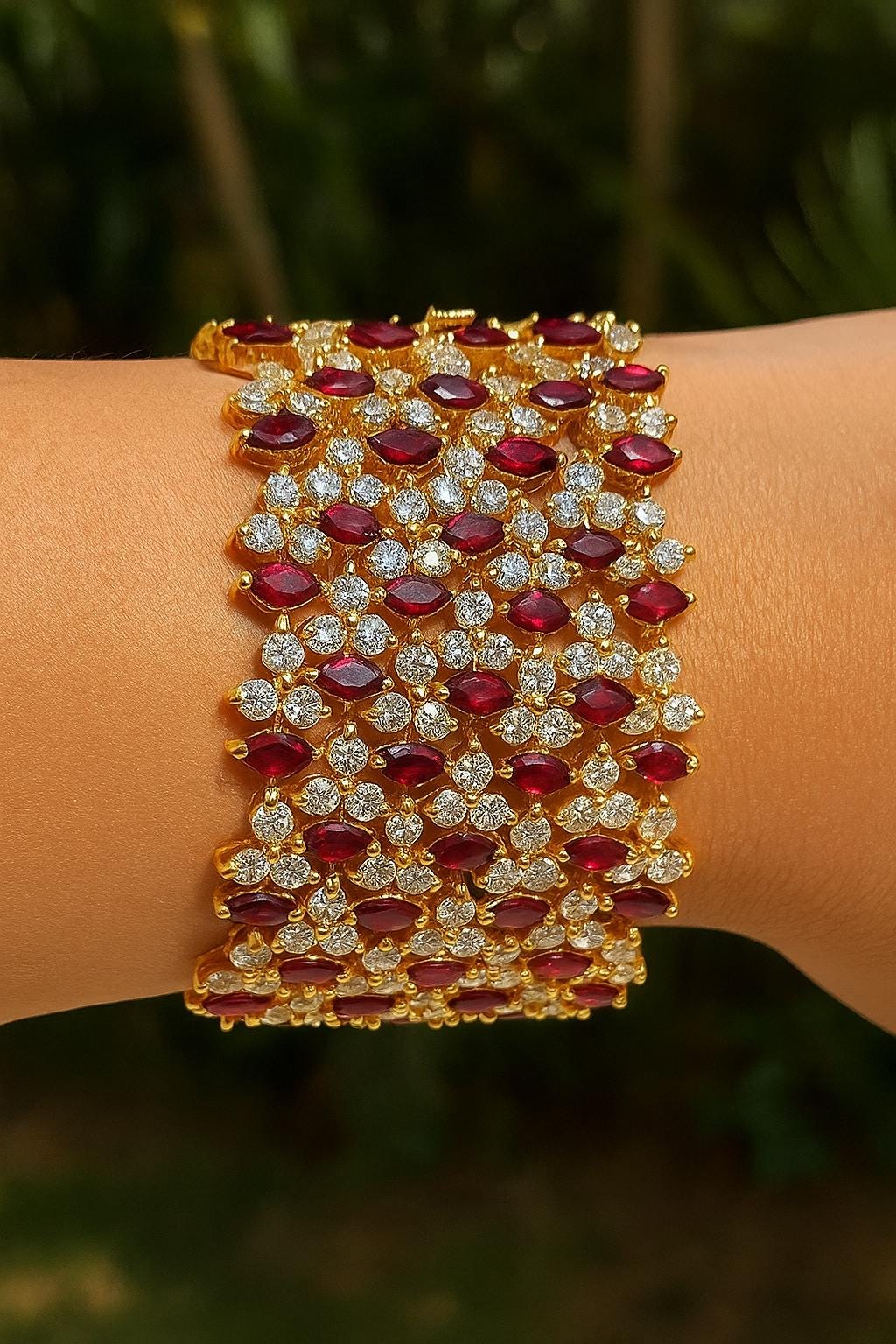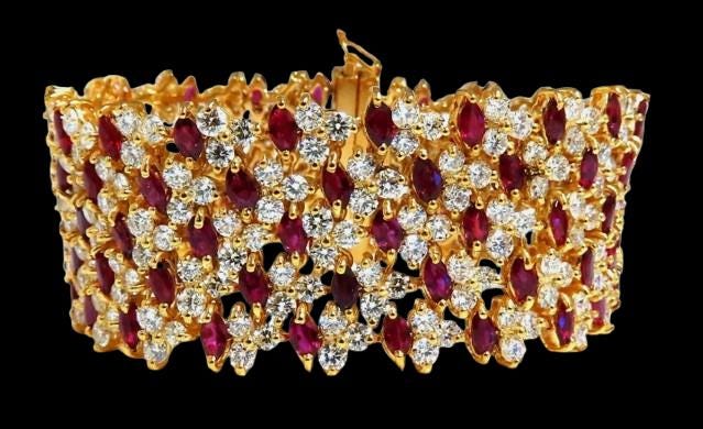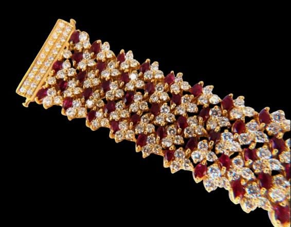 The bracelet’s wide cuff design delivers both bold sophistication and regal presence. Each ruby glows with a deep, rich red hue that symbolizes love and vitality, while the diamonds add captivating fire and brilliance. This statement piece seamlessly blends modern artistry with vintage charm, making it the perfect treasure for collectors and connoisseurs of fine jewelry.