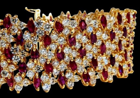44.58 Carat Natural Ruby & Diamond Wide Cuff Bracelet – 14K Yellow Gold Luxury Fine Jewelry