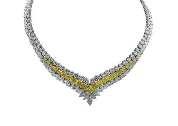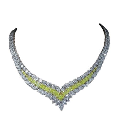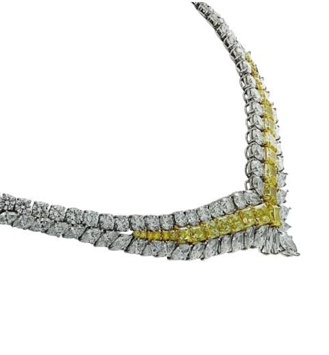 Radiate brilliance and sophistication with this extraordinary 80 Carat Fancy Intense Yellow and White Diamond Necklace, masterfully handcrafted in Platinum and 18K Gold. This luxury high jewelry masterpiece showcases a breathtaking combination of vivid yellow diamonds and brilliant white diamonds, meticulously set to enhance their natural sparkle and fire.