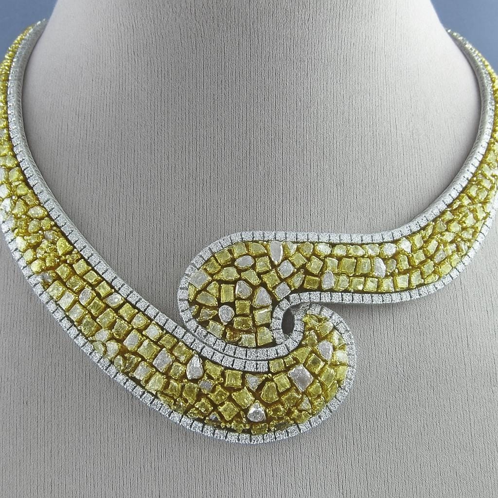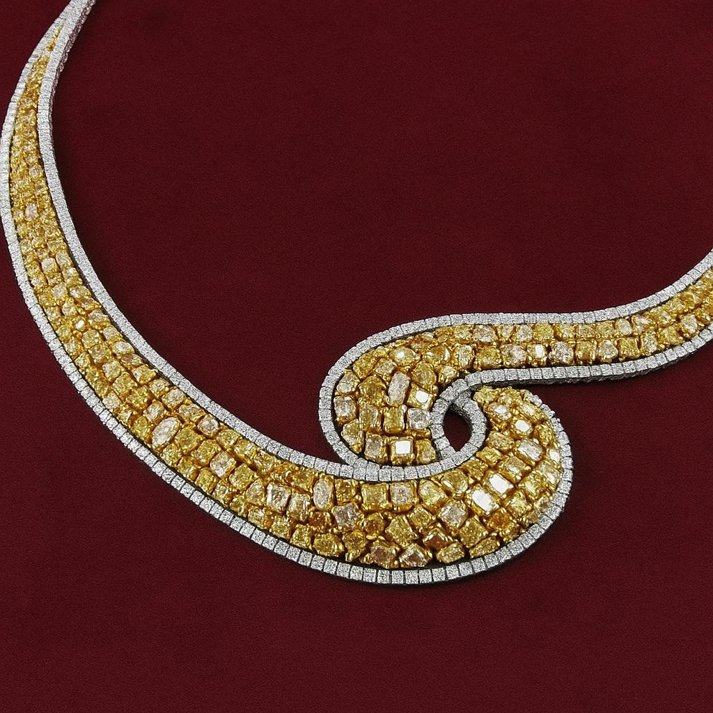 Each diamond in this masterpiece is 100% natural, earth-mined, and untreated, showcasing exceptional brilliance, clarity, and fire. The canary yellow diamonds bring a warm, golden radiance, while the white diamonds enhance the contrast, creating a mesmerizing play of light and color.