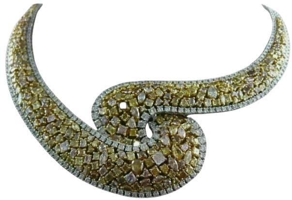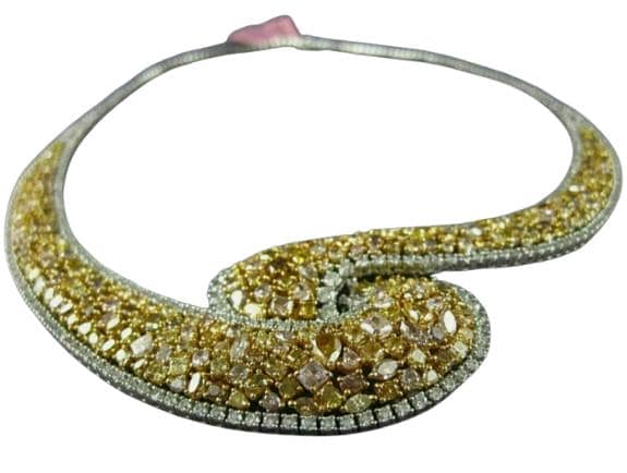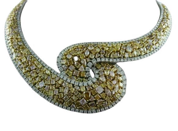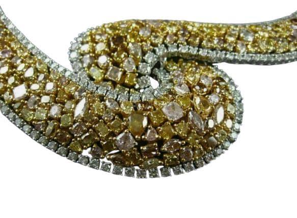 Radiate timeless glamour and refined sophistication with this Extra Large 55.42 Carat White and Canary Diamond Leaf Tennis Necklace, exquisitely handcrafted in 18K Two-Tone Gold. This breathtaking high jewelry creation features a stunning blend of natural fancy yellow (canary) diamonds and brilliant white diamonds, artfully arranged in an elegant leaf motif design that exudes grace and luxury.