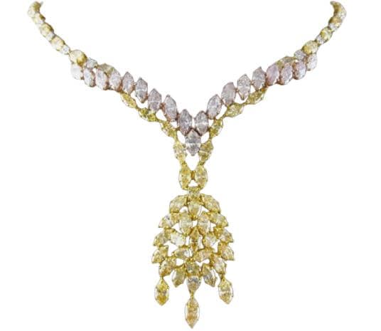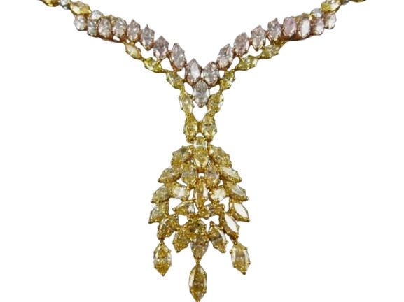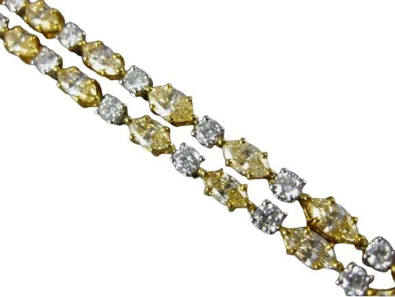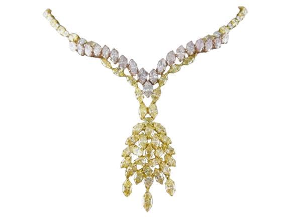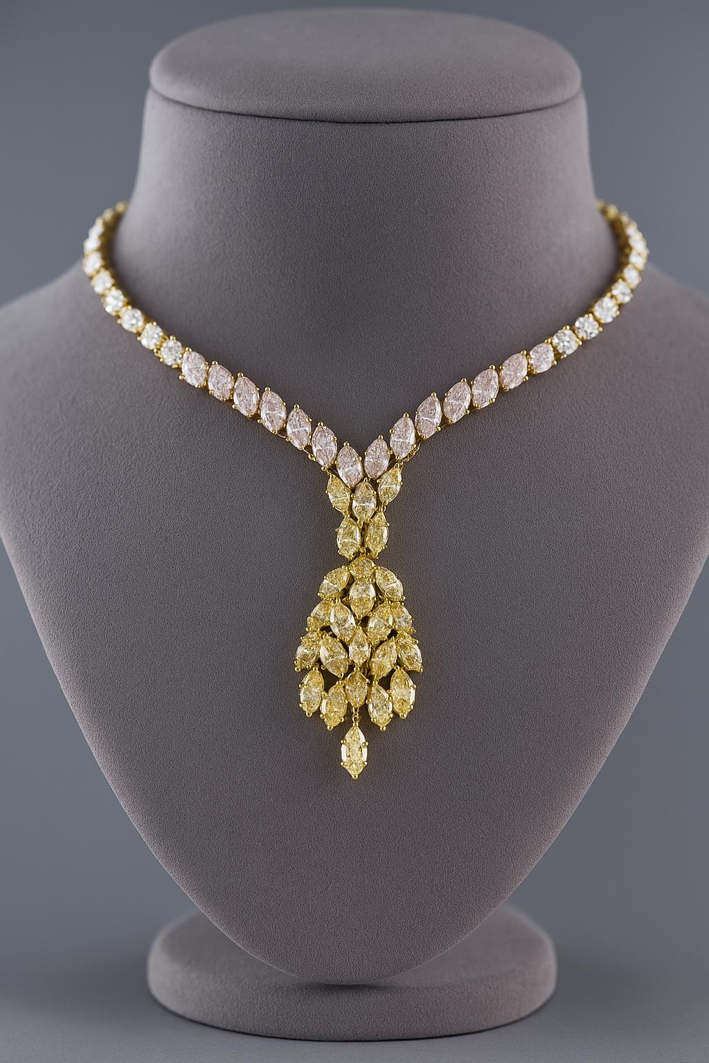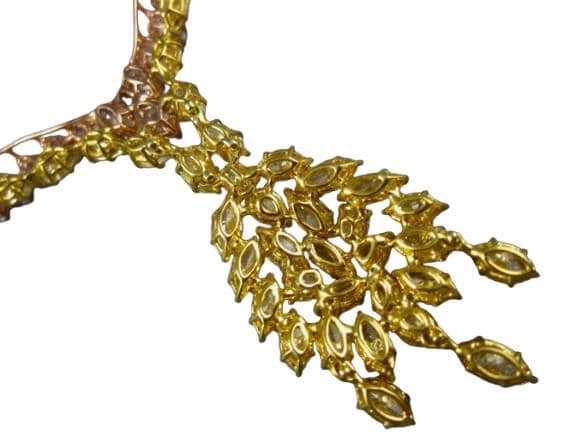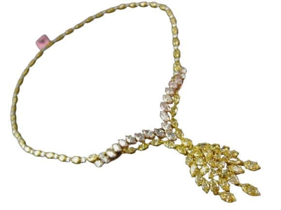 Large 27.42CT Multi-Color Diamond Necklace in 18K Tri-Color Gold | Multi-Leaf Tennis Necklace Fancy Yellow, White & Brown Diamond Jewelry