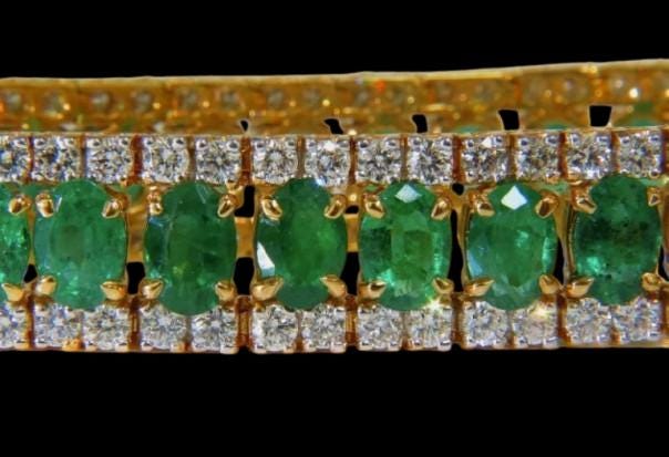 27.65 Carat Natural Vivid Green Emerald & Diamond Bracelet, masterfully handcrafted in 14K Yellow Gold. Each vivid green emerald is carefully selected for its exceptional color and clarity, radiating vibrant elegance. The bracelet is adorned with sparkling F/VS clarity diamonds, adding a touch of dazzling brilliance to the lush emerald hues.