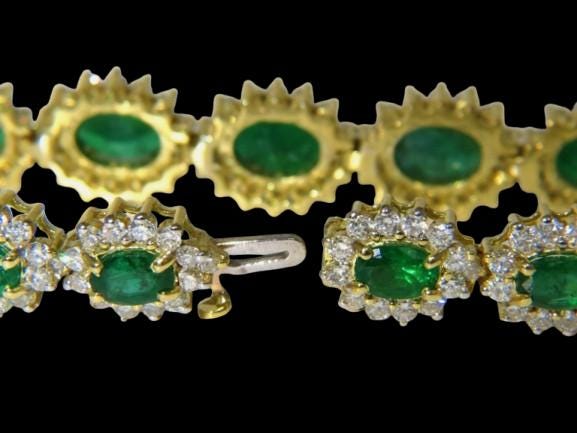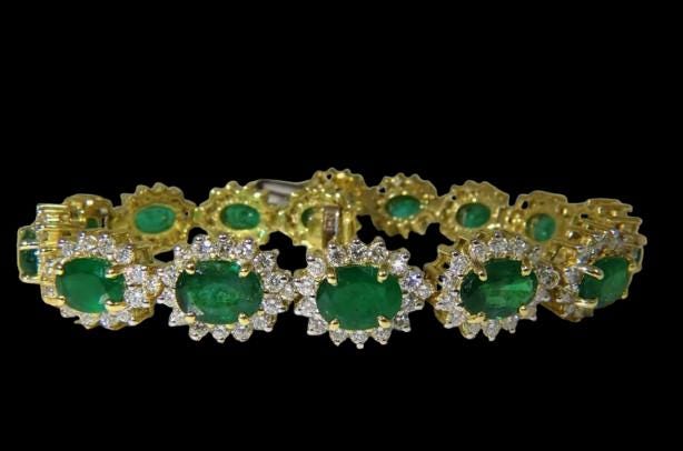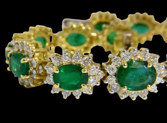 22.50 Carat Natural Emerald & Diamond Bracelet, exquisitely handcrafted in 18K Yellow Gold. This masterpiece radiates sophistication and elegance, making it a statement piece for collectors and jewelry lovers alike. Designed to dazzle, it features vivid green natural emeralds complemented by brilliant-cut natural diamonds, each carefully set to maximize brilliance and color contrast.