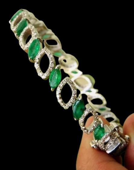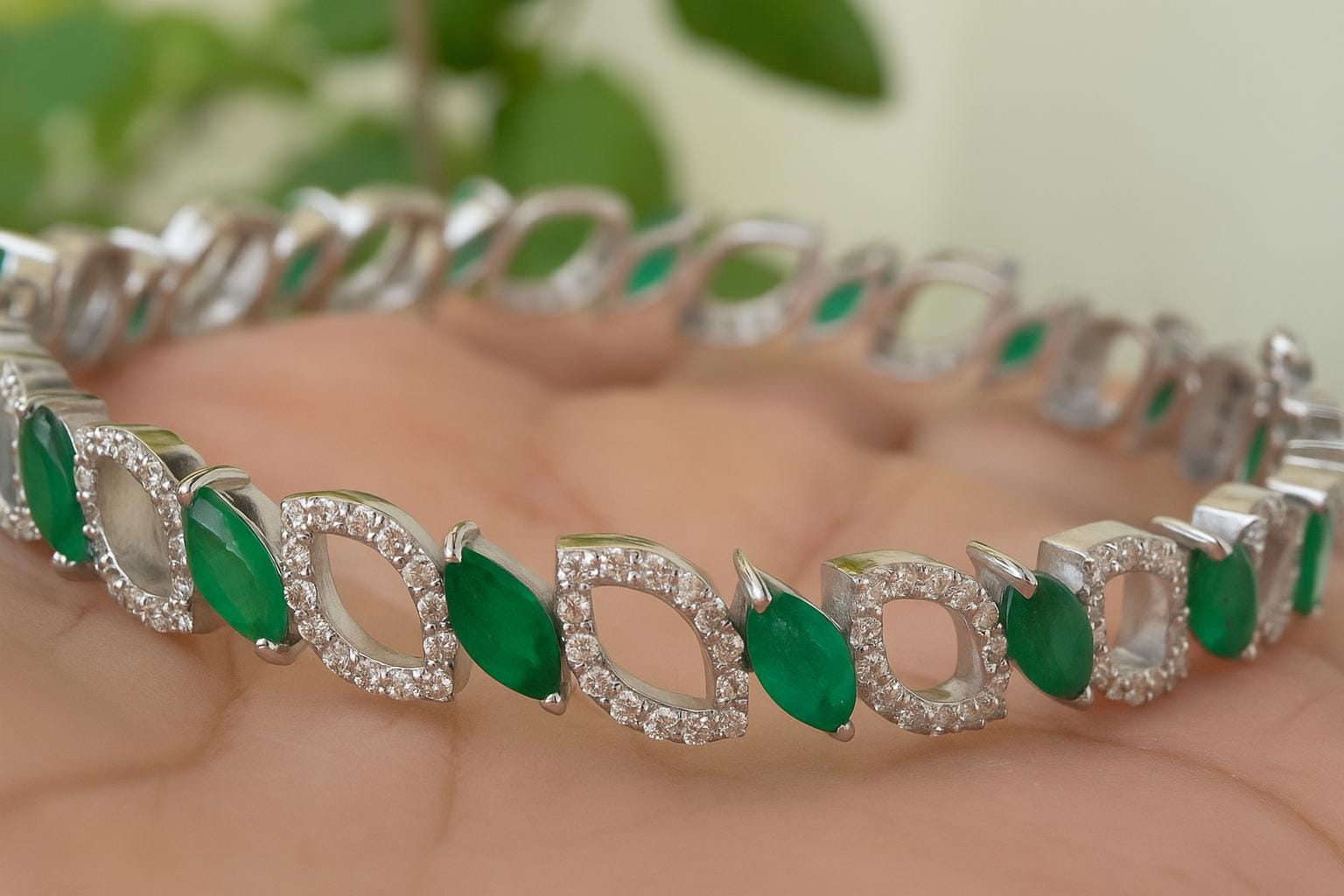 Each vivid natural emerald in this bracelet is hand-selected for its rich green hue and exceptional clarity, symbolizing renewal, love, and harmony. The emeralds are beautifully complemented by sparkling natural round-cut diamonds, meticulously set in luminous 14K white gold to create a breathtaking contrast of color and light.