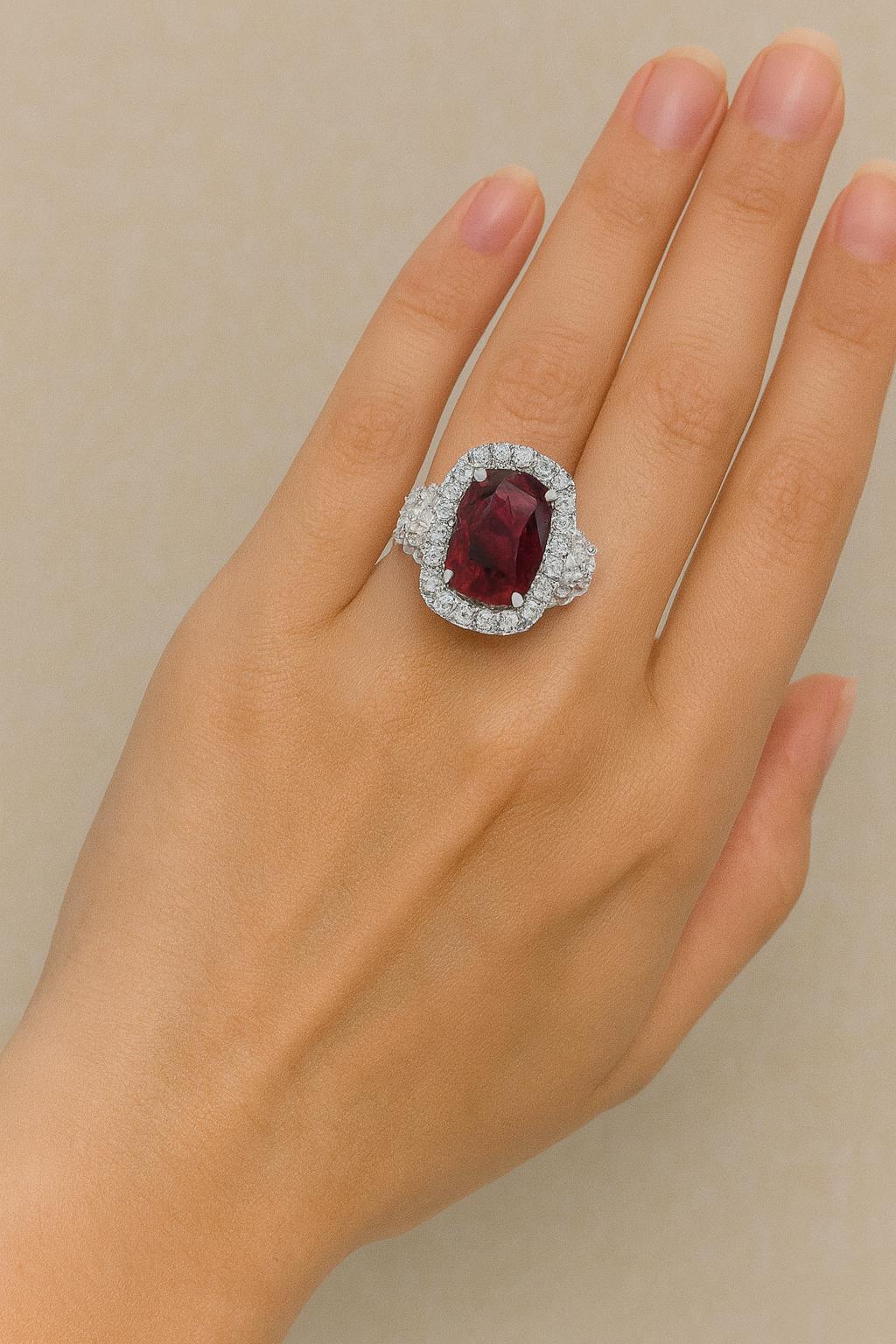 9.58CT Diamond & AAA Ruby Engagement Ring, handcrafted in premium 18K White Gold. Featuring a fiery, richly saturated natural AAA ruby surrounded by brilliant natural diamonds, this ring radiates elegance, sophistication, and luxury from every angle.