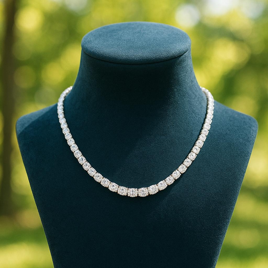 Each diamond is expertly selected for its exceptional fire, clarity, and brilliance, then handset in a sleek 18K white gold frame that ensures durability, shine, and a high-luxury finish. Whether worn for a glamorous evening, a bridal look, or as a signature everyday statement, this classic tennis necklace delivers breathtaking beauty from every angle.