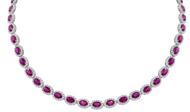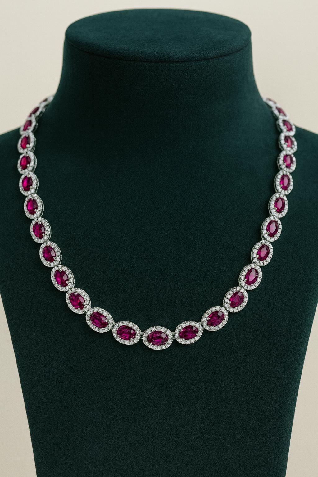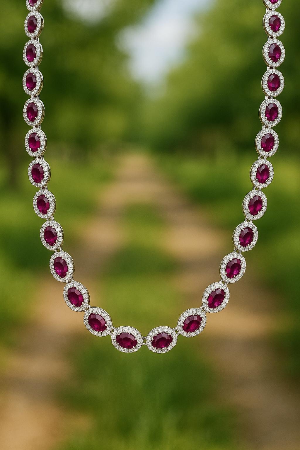 The necklace features 6.43 carats of natural diamonds in F/G color and VS–SI clarity, hand-set to maximize fire, sparkle, and brilliance. Paired with 19.40 carats of vivid AAA oval rubies, each ruby is selected for its intense color saturation, clarity, and luxurious finish. The eternity layout ensures seamless beauty all around, making it perfect for both front-facing and full-round visibility.