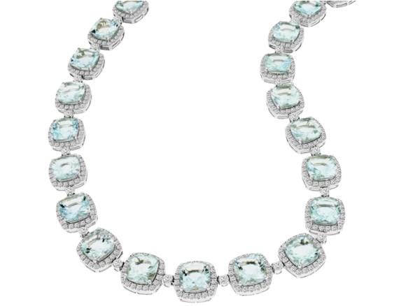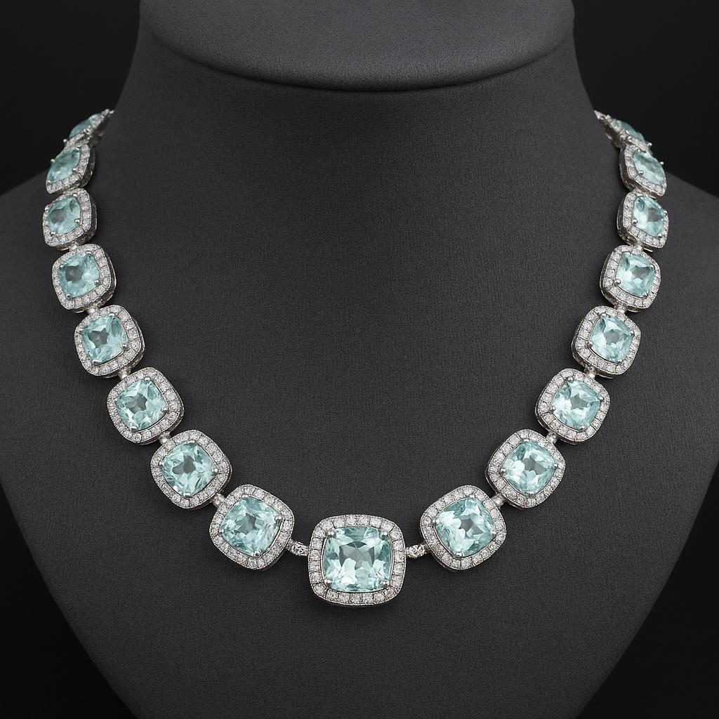 Indulge in pure luxury with this Large 14KT White Gold Aquamarine & Diamond Tennis Necklace, masterfully crafted in a bold and elegant 3D square design. This breathtaking 17-inch necklace features an extraordinary combination of AAA extra-faceted aquamarines totaling 74.00 carats and 12.50 carats of brilliant round diamonds, making it a true statement piece for collectors of fine high-end jewelry.