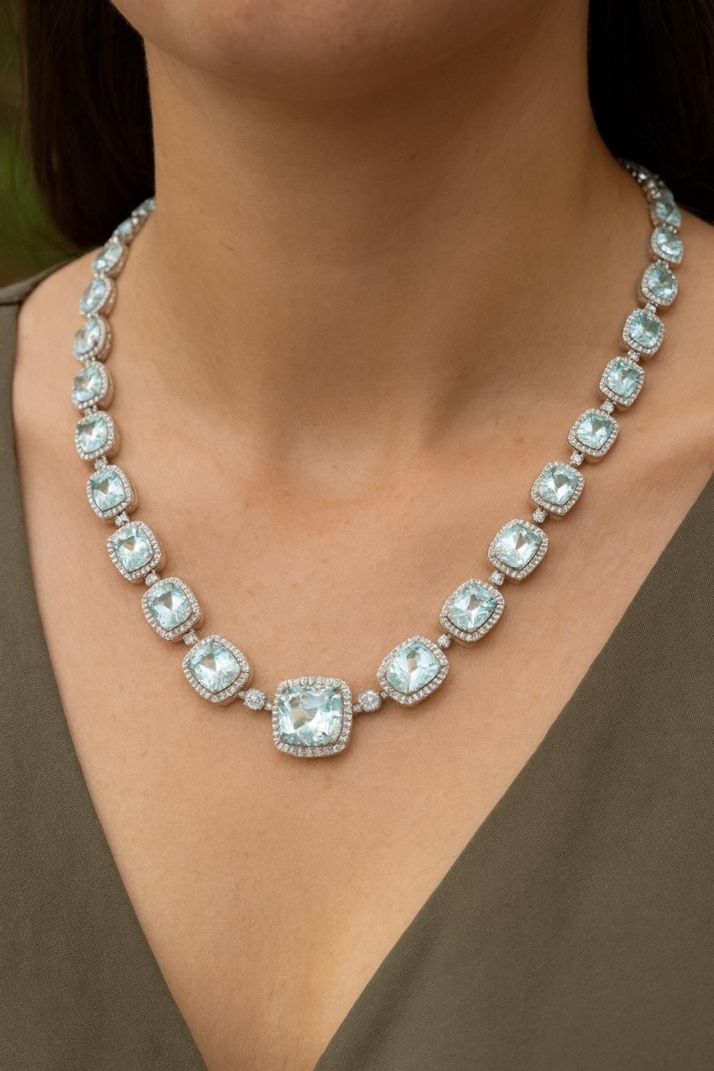 Aquamarine Diamond Necklace | 14K White Gold, Cushion Cut Statement Jewelry