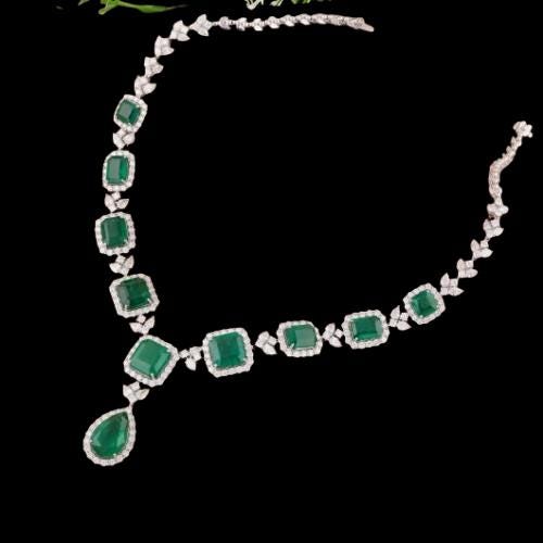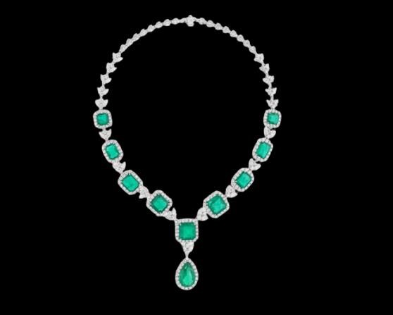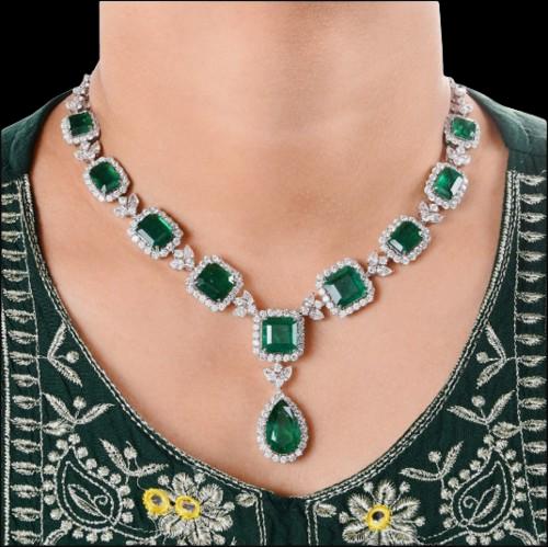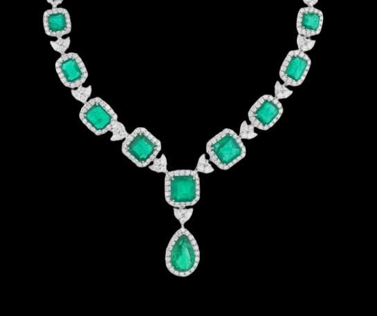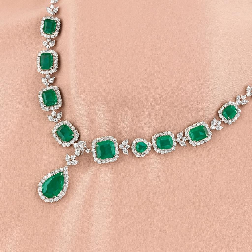 Surrounding each emerald are sparkling SI/H diamonds, meticulously arranged to maximize light reflection and brilliance. Every gemstone is perfectly matched and set by skilled artisans to create a seamless flow of shimmering beauty. This necklace brings together classic elegance and contemporary luxury, making it an exceptional accessory for weddings, special occasions, and upscale events.